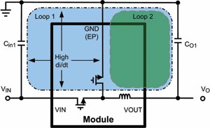 在規(guī)劃電源布局時(shí),首先要考慮的是兩個(gè)開關(guān)電流環(huán)路的物理環(huán)路區(qū)域。雖然在電源模塊中這些環(huán)路區(qū)域基本看不見,但是了解這兩個(gè)環(huán)路各自的電流路徑仍很重要,因?yàn)樗鼈儠?huì)延至模塊以外。在圖1所示的環(huán)路1中,電流自導(dǎo)通的輸入旁路電容器(Cin1),在高端MOSFET的持續(xù)導(dǎo)通時(shí)間內(nèi)經(jīng)該MOSFET,到達(dá)內(nèi)部電感器和輸出旁路電容器(CO1),最后返回輸入旁路電容器。
