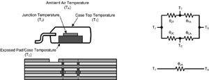 現(xiàn)在來(lái)快速了解一下如何進(jìn)行不含散熱片的簡(jiǎn)單PCB散熱設(shè)計(jì),圖3示意了模塊及作為熱阻抗的PCB。與從結(jié)到裸片焊盤的熱阻抗相比,由于結(jié)與外封裝頂部間的熱阻抗相對(duì)較高,因此在第一次估計(jì)從結(jié)到周圍空氣的熱阻(θJT)時(shí),我們可以忽略θJA散熱路徑。