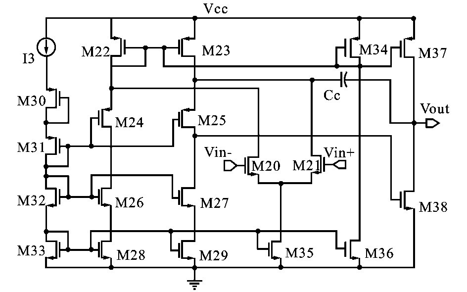 以上分析可知運(yùn)算放大器起著重要作用,其必須具有較高的增益,才能使A 點(diǎn)電壓精確跟隨參考電壓,從而準(zhǔn)確設(shè)定B 點(diǎn)電平和滯環(huán)電壓大小。 另外由于V out的變化頻率與系統(tǒng)開(kāi)關(guān)頻率相同(系統(tǒng)的最大開(kāi)關(guān)頻率約為2MHz) ,使得流過(guò)M1 的電流也相同頻率在IM1和I′M1之間快速切換,所以運(yùn)放的單位增益帶寬須大于系統(tǒng)的最大開(kāi)關(guān)頻率。 設(shè)計(jì)的運(yùn)放結(jié)構(gòu)如圖4 所示,采用折疊式輸入結(jié)構(gòu),可以獲得較大的共模輸入電壓范圍。