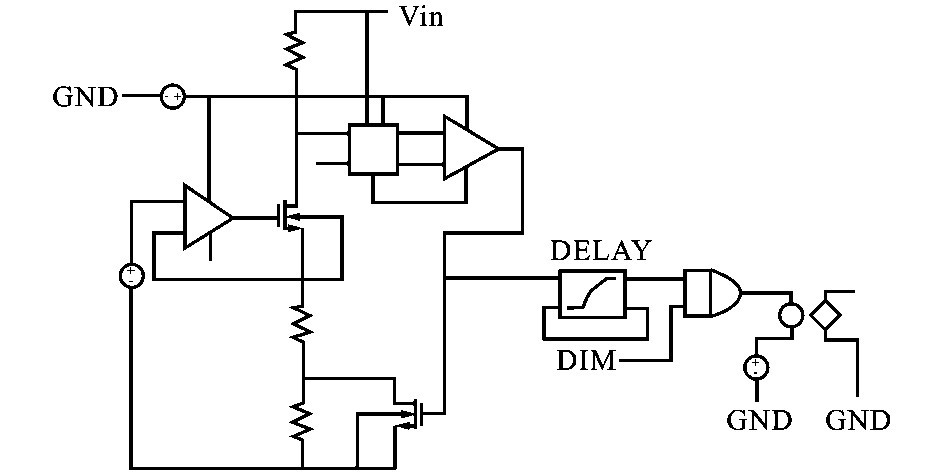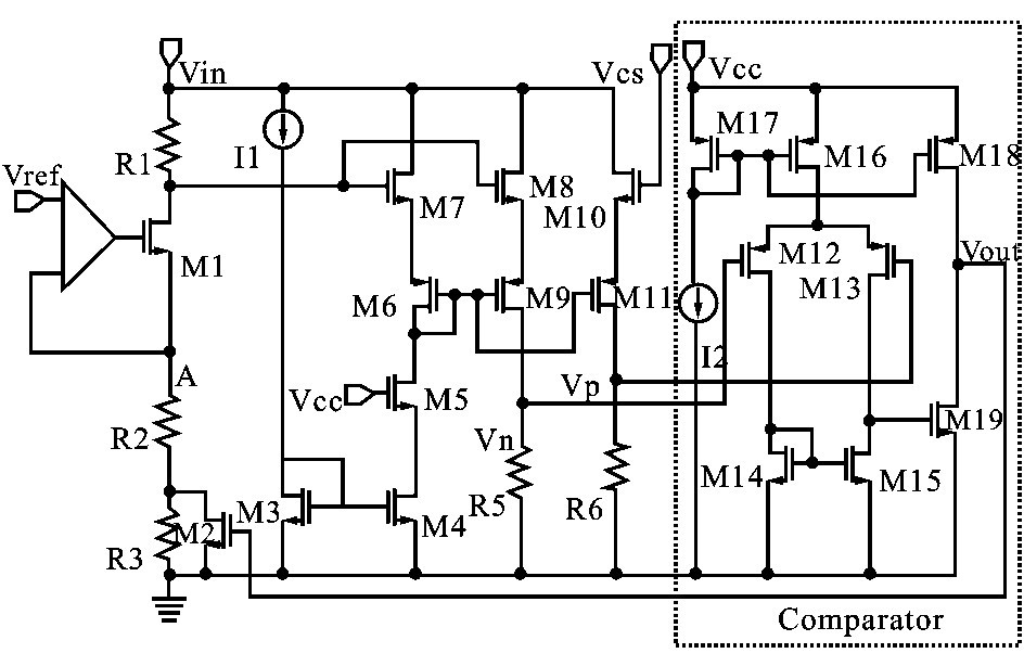 4. 5V~28V 的輸入電壓經(jīng)調(diào)整轉(zhuǎn)換為5V 的恒定電壓Vcc 為后續(xù)電路供電。 如圖3 所示,A 點(diǎn)電位受運(yùn)算放大器鉗制,將等于參考電壓1. 2V ,假設(shè)輸出V out 為高電平,則M2 導(dǎo)通,流過(guò)M1 的電流為IM1 = V ref / R2 ,B 點(diǎn)的電壓為V BL = V in - IM1 R1 ;當(dāng)V out為低電平,M2 截止,流過(guò)M1 的電流變?yōu)镮′M1= V ref / ( R2 + R3 ) ,B 點(diǎn)電壓升高為V BH = V in -I′M1 R1 ,所以B 點(diǎn)電壓的變化為ΔV B = V BH - V BL= V ref R1 R3/ R2 ( R2 + R3) ,這意味著V out由高電平變成低電平時(shí)在B 點(diǎn)產(chǎn)生的一個(gè)滯環(huán)電壓,可見(jiàn)該滯環(huán)電壓與輸入電壓無(wú)關(guān),只由參考電壓V ref和電阻大小決定,通過(guò)選擇各電阻的阻值便可設(shè)定滯環(huán)電壓的大小。