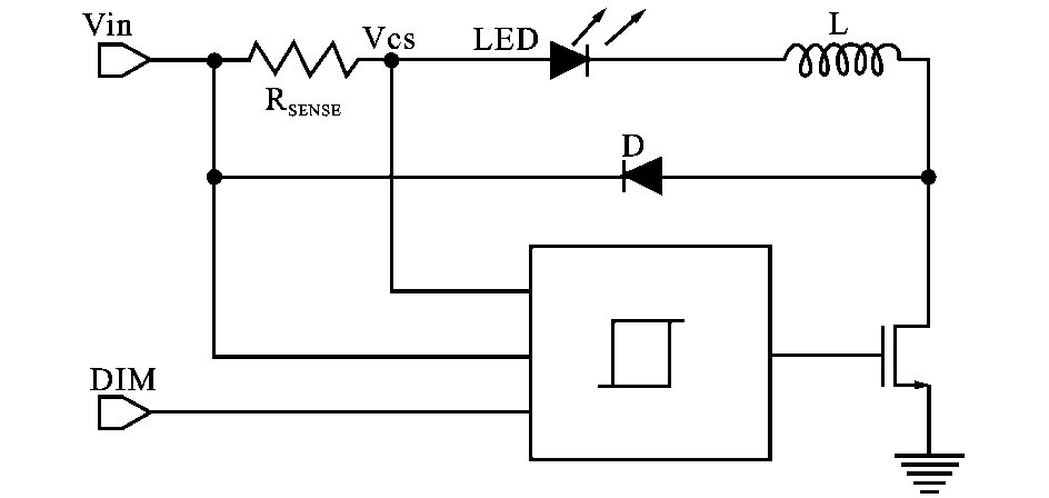 滯流控制模塊內(nèi)部電路如圖2 所示,當(dāng)DIM 信號(hào)為高電平期間,當(dāng)Vcs 大于上電壓閾值時(shí),控制電路輸出低電平,關(guān)閉功率開(kāi)關(guān)管。 由LED、電感L 、續(xù)流二極管D 和RSENSE組成的回路使得電感繼續(xù)為L(zhǎng) ED 提供電流,電感電流逐漸減小,使得檢測(cè)電壓Vcs 隨之減小;當(dāng)Vcs 小于下閾值電壓時(shí),控制電路輸出高電平,導(dǎo)通功率開(kāi)關(guān)管,此時(shí)D 截止,形成從電源經(jīng)RSENSE、L ED、L 和功率開(kāi)關(guān)管到地的回路,電源為電感L 充電,電感電流上升,檢測(cè)電壓Vcs隨之升高。 Vcs 大于上電壓閾值時(shí),控制電路關(guān)斷開(kāi)關(guān)管,重復(fù)上個(gè)周期的動(dòng)作,這樣就完成了對(duì)L ED驅(qū)動(dòng)電流的滯環(huán)電流控制,使得流過(guò)L ED 的驅(qū)動(dòng)電流,也就是電感電流的平均值恒定。