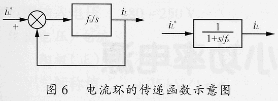 將s=2πfc代入上式,并令上式等于1時,可得環(huán)路的剪切頻率fc=fs/(2π)。因此,可將電流環(huán)等效為延時時間常數(shù)為一個開關(guān)周期的純慣性環(huán)節(jié),如圖6所示。顯然,當電流誤差放大器的增益GCA小于最優(yōu)值時,電流響應(yīng)的延時將會更長。