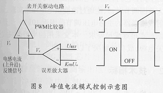 平均CMC由于要采樣濾波電感的電流,有時顯得不太方便,因此,實踐中經(jīng)常采用一種變通的電流模式控制方法,即峰值CMC,如圖8所示。電壓外環(huán)輸出控制量(Vc)和由電感電流上升沿形成的斜坡波形(Vs)通過電壓比較器進行比較后,直接得到開關(guān)管的關(guān)斷信號(開通信號由時鐘自動給出),因此,電壓環(huán)的輸出控制量是電感電流的峰值給定量,由電感電流峰值控制占空比。