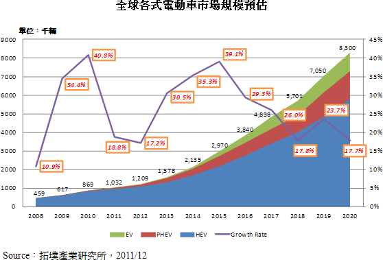 2020年前全球新能源車市場成長動能主要以油電混合車(Hybrid Electric Vehicle;HEV)為主,預(yù)計目前仍為全球電動車銷售上升主力,約占整體電動車市場70%。2011年后隨著鋰電池技術(shù)漸趨成熟,插電式油電混合車(Plug-in Hybrid Electric Vehicle;PHEV)市場逐漸起飛,2012年起將呈顯著成長,2020年銷售量將達150萬輛,占整體電動車市場的18%,而完全仰賴電池做為動力來源的純電動車(Battery only Electric Vehicle;BEV),由于各國政策推動期程不一,現(xiàn)仍處于示范運行階段,預(yù)計2020年占整體電動車市場的12%。