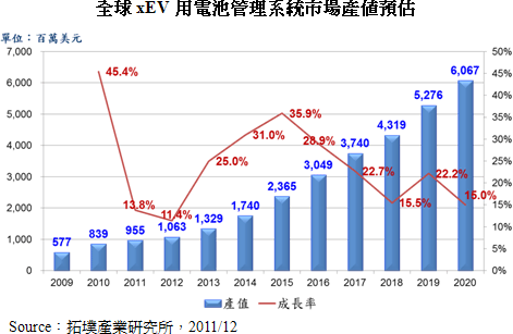 因此,透過BMS能準確量測電池組使用狀況,保護電池不至于過度充放電,平衡電池組中每一顆電池的電量,以及分析計算電池組的電量并轉(zhuǎn)換為駕駛可理解的續(xù)航力信息,確保動力電池可安全運作。拓墣預(yù)測2012年全球BMS市場產(chǎn)值成長逾10%,2013年至2015年成長幅度將大幅躍升至25%~35%。