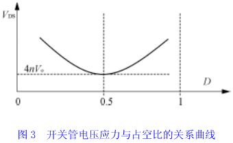 上式說明,當變壓器匝比愈小時,對于一定的輸入電壓和輸出電壓的變換器,開關管電壓應力vds愈小。所以,有源鉗位正激變換器一個顯著優(yōu)點是可以降低開關管電壓應力,從而可選用額定電壓較低、通態(tài)電阻較小的功率開關管。另外,當變壓器變比n確定后,開關管電壓應力僅與占空比有關,如圖3所示。顯然,當占空比為0.5時,開關管承受最小的電壓應力。當輸入電壓變化時,如果將占空比設計運行在以0.5為中心的對稱范圍內,則可使開關管承受的電壓應力基本保持恒定。