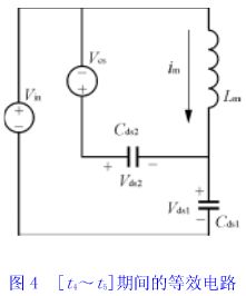 [t4~t5]期間電容cds1、cds2與lm發(fā)生諧振,并在t5時刻電壓vds1下降到vin,變壓器磁芯完成磁恢復。