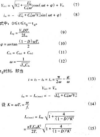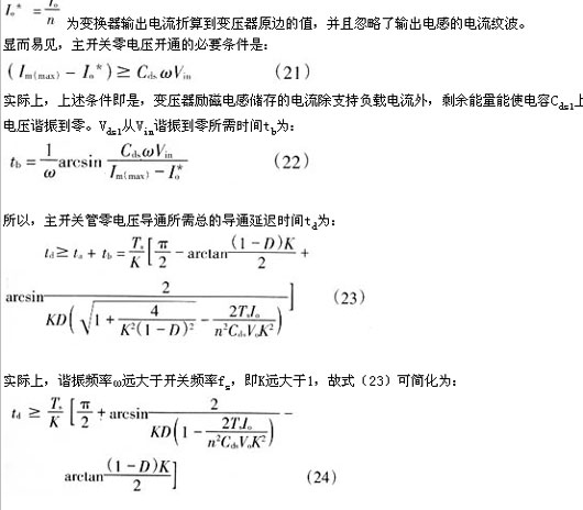 從上面的分析可明顯地看出,當變壓器勵磁電感l(wèi)m減小,勵磁電流足夠大時,[t5~t0′]期間勵磁電流除了能提供負載電流外,剩余部分可用來幫助電容cds2、cds1充放電。電壓vds1有可能諧振到零,從而實現(xiàn)主功率開關管s的零電壓軟開通。二極管d1可為負的勵磁電流續(xù)流。關鍵工作波形如圖2(b)所示,具體的軟開關條件將在下一節(jié)中詳細討論。很顯然,軟開關的代價是變壓器勵磁電流和開關管導通電流峰值大幅增加,開關管及變壓器電流應力和通態(tài)損耗明顯加大。