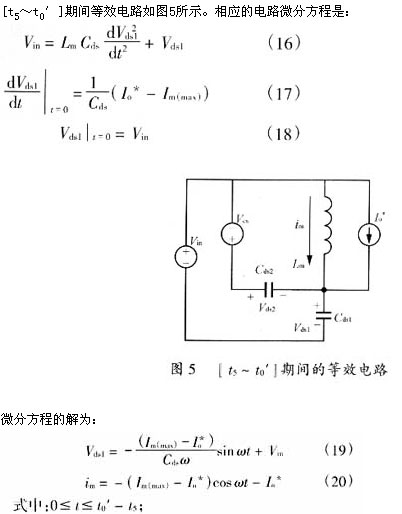 當輔助開關sa斷開后,由于磁飽和電感l(wèi)s瞬間相當于開路,因此變壓器勵磁電流可完全用來對cds2和cds1充放電。[t4~t5]、[t5~t0′]期間,等效電路同圖4。顯然,令式(21)和(24)中io*或io為零,即可得到主開關管零電壓導通的能量條件和時間條件,im(max)≥cdsωvin,即: