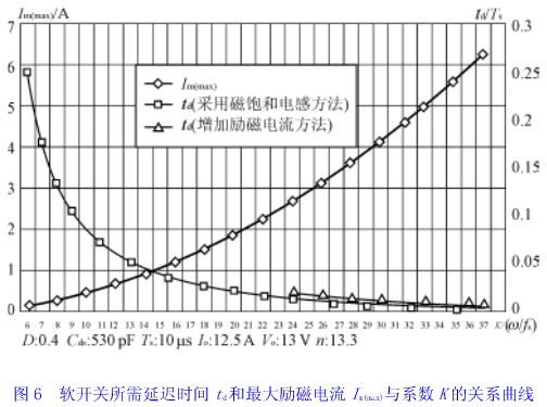 死區(qū)延遲時間,意味著pwm變換器有效占空比的損失。為了盡量減小有效占空比的損失,則k必須加大。另一方面,變換器開關頻率fs愈高,則為保持相同的有效占空比,k至少應保持不變,即諧振頻率ω應與開關頻率fs成比例增加。圖6給出了軟開關所需要的死區(qū)時間td和最大勵磁電流im(max)與k的關系曲線。從圖中明顯看出,采用加大勵磁電流的方法實現(xiàn)零電壓軟開關和采用磁飽和電感器比較,要求的k較大,因而有較大的勵磁電流損耗;另外,從式(15)看出,開關頻率愈高,電流峰值也愈高,變壓器的銅耗和開關管的導通損耗也愈大。因此,軟開關有源鉗位正激變換器工作頻率不宜太高。