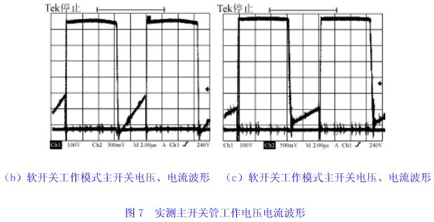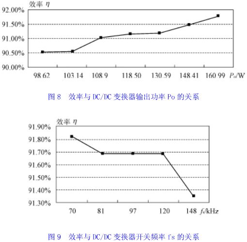 圖7(a)、7(b)、7(c)給出了實測的主開關管工作電壓、電流波形。圖7(a)顯示主開關管工作在硬開關狀態(tài)。圖7(b)和圖7(c)分別是采用增加勵磁電流方法和應用磁飽和電感器方法實現(xiàn)零電壓軟開關的電壓電流波形,后者明顯地降低了勵磁電流和開關管電流的峰值。實測波形與理論分析完全一致。圖8、9顯示出了實測的效率曲線。從圖9中看出,當變換器開關頻率增加時,變壓器勵磁電流損耗和開關管通態(tài)損耗所占比重增加,變換器效率降低了。實驗結果驗證了理論分析。