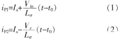 (2)工作模態(tài)2[t0-t2] 如圖3(b)所示,t1時(shí)刻,D2、D3中反向恢復(fù)電流達(dá)到最大值,D5、D6導(dǎo)通,D2、D3達(dá)到瞬時(shí)反向電壓Vo,緩沖電容C1(C2)和副邊漏感Lo’開(kāi)始諧振。Vin、VC分別加在原邊繞組Np1、Np2上,ip1正向增大,ip2減小并反向增大。