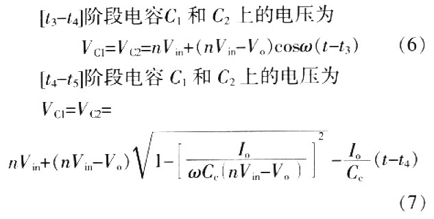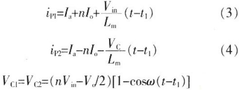 兩端電壓從零開(kāi)始諧振增大,在半個(gè)諧振周期后達(dá)到最大值VC1max=VC2max=2nVin-Vo,此時(shí)模態(tài)2結(jié)束。模態(tài)2中,VD5=VD6=0,VD7=Vo。二極管D2、D3兩端反向電壓從V0逐漸增大VD2=VD3=4nVin-V0。