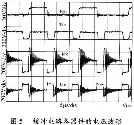 圖5給出了緩沖電路各器件的電壓波形,波形從上往下依次是vgsl、vC1、vD7、vD5。當(dāng)任何一個(gè)開(kāi)關(guān)管開(kāi)通時(shí),緩沖電容充電,抑制了關(guān)斷整流管的電壓尖峰;當(dāng)任何一個(gè)開(kāi)關(guān)管關(guān)斷時(shí),緩沖電容給負(fù)載釋放能量,然后4個(gè)整流二極管均導(dǎo)通續(xù)流。整流二極管和緩沖二極管上振蕩周期均為