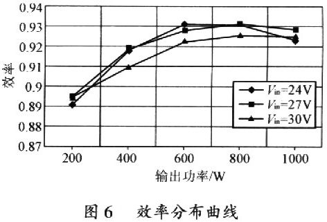圖6為該變換器在24V、27V、30V輸入時(shí)對(duì)應(yīng)不同輸出功率的的效率分布曲線圖。其中輸入電壓為24V,輸出功率600W時(shí)最高效率可達(dá)93.1%,27V滿載1 000W時(shí)效率為92.8%。
