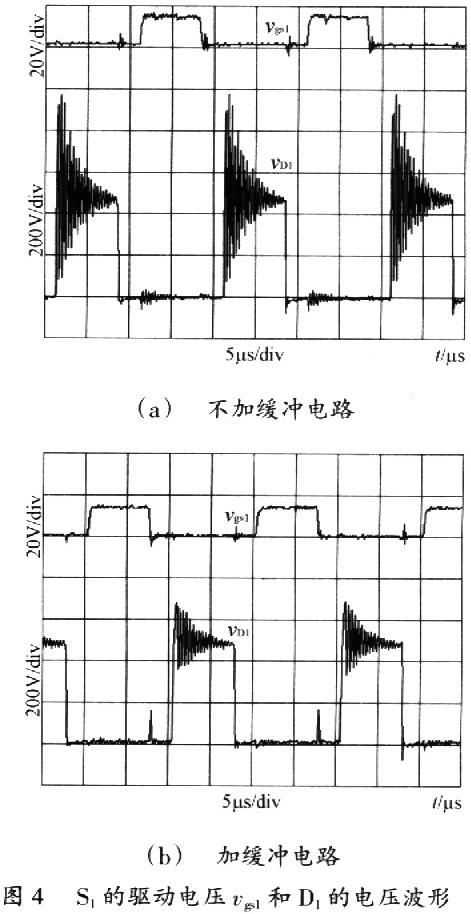 為了驗(yàn)證無(wú)損緩沖電路的尖峰吸收過(guò)程,研制了一臺(tái)1 000W的實(shí)驗(yàn)樣機(jī)。實(shí)驗(yàn)參數(shù)確定為:Vin=18V~32V,Vo=360V,n=9.5,C=33.3μF,L1=L2=320μH,C1=C2=4.7nF,C3=C4=470μF,Ts=20μs。S1和S2為FQAl40N10;D1、D2、D3、D4采用CSD10120,D5、D6、D7采用DSE112-06。