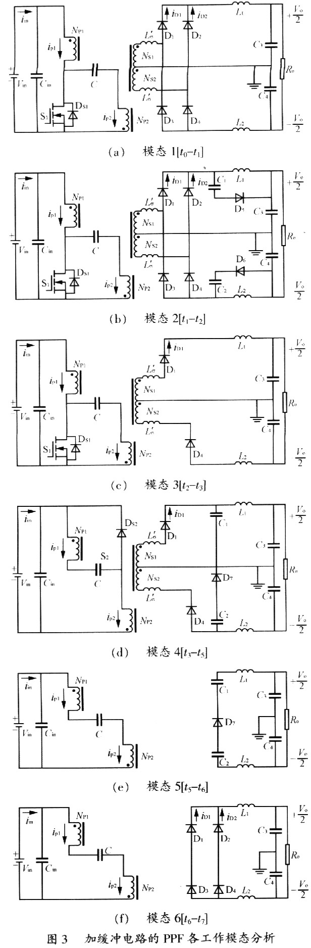 圖1為加無(wú)損緩沖吸收的PPF電路。Ds1、Ds2分別為開(kāi)關(guān)管S1、S2寄生的反并二極管,變壓器的Np1=Np2=Np、Ns1=Ns2=Ns分別為原、副邊的匝數(shù),匝比n=Ns/Np,原邊兩個(gè)繞組的勵(lì)磁電感均為L(zhǎng)m,Lo(圖1中未標(biāo)出)為變壓器原邊繞組的漏感.Lo’為折算到變壓器副邊繞組的漏感,D5、D6、D7、C1、C2構(gòu)成無(wú)損緩沖吸收電路,且C1=C2=Cc。變壓器副邊兩個(gè)繞組的連接點(diǎn)與輸出濾波電容C3和C4的中點(diǎn)相連,輸出電壓為±V0/2。
