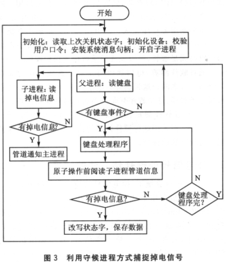 另一種方式是采用守候進程的方式,開通一個進程,此進程專門等待中斷信號。主程序根據(jù)數(shù)據(jù)操作對象的不同,將自己的流程方案劃分成若干原子操作,所謂原子操作即劃定的程序塊要么完全執(zhí)行,要么不執(zhí)行。每個操作對應(yīng)惟一狀態(tài)標志。在每個原子操作前,主進程都將會通過管道通信的方式閱讀中斷信號。如果中斷信號產(chǎn)生,主進程首先保存狀態(tài)標志,然后將相關(guān)數(shù)據(jù)寫往Flash后退出,電源恢復(fù)后,主進程首先根據(jù)標志字確定系統(tǒng)恢復(fù)方案。圖3用流程圖的方式實現(xiàn)這一過程。