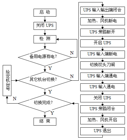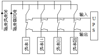 本系統(tǒng)主要是利用現(xiàn)有發(fā)電機(jī)組在不停機(jī)的情況下進(jìn)行雙電源切換。原來電源切換是在主供電回路上通過一個(gè)雙頭刀閘切換,現(xiàn)在將用電系統(tǒng)分割成四個(gè)單元,在每個(gè)分路上各安裝一個(gè)雙頭刀閘,分別對假捻機(jī)進(jìn)行逐臺切換。雙頭刀閘切換是人工操作,刀閘在轉(zhuǎn)換過程中會出現(xiàn)瞬間斷電現(xiàn)象,這樣就會造成假捻機(jī)停機(jī),這是電源切換不能連續(xù)生產(chǎn)的原因,解決這個(gè)問題是本方案設(shè)計(jì)關(guān)鍵。所以,在電源切換前先將要切換電源假捻機(jī)的電加熱和風(fēng)機(jī)停下來降低負(fù)荷,然后將不間斷電源UPS串聯(lián)在要切換的電路中,雙頭刀閘轉(zhuǎn)換時(shí)用UPS的電池組為假捻機(jī)提供傳動系統(tǒng)的電源,就不會出現(xiàn)斷電現(xiàn)象,可以對該假捻機(jī)進(jìn)行電源切換。切換完成后將UPS退出供電系統(tǒng),再將電加熱和風(fēng)機(jī)開啟,這樣就完成了一臺假捻機(jī)的切換。再進(jìn)行下一臺的切換,以此循環(huán)便可完成全部假捻機(jī)的切換(圖2)。