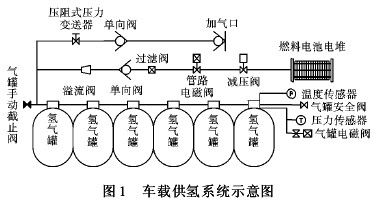 為了保證燃料電池汽車的安全穩(wěn)定運行,需要設(shè)計一套安全有效的供氫系統(tǒng)。在燃料電池汽車上,供氫系統(tǒng)一般包括電磁閥、安全閥、溢流閥、熱熔栓、手動截止閥、溫度傳感器和壓力傳感器等在內(nèi)的輔助安全裝置,其示意圖如圖 1 所示[9]。車載供氫系統(tǒng)安全措施應(yīng)從預(yù)防與監(jiān)控兩方面著手。從預(yù)防的角度來說,筆者以國內(nèi)研發(fā)的燃料電池中巴車為例,給出了車載供氫安全實例。
