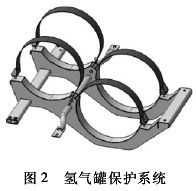 ( 2) 氫氣罐保護。高壓氫氣罐的固定支架和鋼帶應(yīng)有足夠的強度,以保證在碰撞過程中,高壓氫氣罐的動態(tài)位移不會太大,避免造成連接管路的斷裂、變形和氫氣的大量泄漏。何?。?3]基于顯式有限元理論,按照 CMVDR294 法規(guī)對國內(nèi)自主開發(fā)的某燃料電池轎車進行正面碰撞分析,對比分析兩種氫氣罐保護系統(tǒng)設(shè)計方案的計算結(jié)果,提出了安全有效的氫氣罐保護方案,即氫氣罐保護系統(tǒng)采用整體式設(shè)計。如圖 2 所示,氫氣罐框架通過 3 根橫梁和 2 根縱梁將兩個氫氣罐集成到一個框架總成??v梁截面為“Π”形,由幾塊板材拼焊而成,中部設(shè)計出兩個圓弧形凹槽,可以對氫氣罐進行有效的固定和保護。