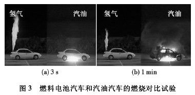 邁阿密大學(xué)的 MICHAEL[15]分別對燃料電池汽車和汽油汽車的燃燒進行對比試驗,將兩輛汽車分別用氫氣和汽油做燃料,然后做泄漏點火試驗,如圖 3 所示。點火 3 s 后,高壓氫氣產(chǎn)生的火焰直噴上方,而汽油由于比空氣重,則從汽車的下部著火。到 1 min 時,氫氣作燃料的汽車只有漏出的氫氣在燃燒,汽車沒有大問題; 而汽油車則早已成為一個大火球,完全燒光。這說明氫氣汽車比現(xiàn)在普遍使用的汽油車安全得多。