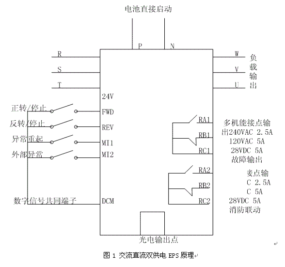 目前EPS采用的控制方式和控制手段不同,針對(duì)EPS所帶的負(fù)載可以歸納三種:一是主要用于應(yīng)急照明和事故照明的EPS;二是除了應(yīng)急照明、事故照明之外,還有應(yīng)用于空調(diào)、電梯、卷簾門、排氣風(fēng)機(jī)、水泵等混合負(fù)載的三相系列EPS;三是直接給電動(dòng)機(jī)供電的變頻系列EPS。本文介紹的是最全面的混合負(fù)載三相系列EPS供電。