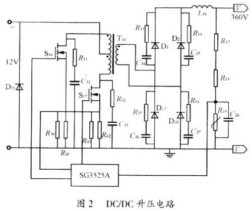 其工作原理為將升壓變壓器的中心抽頭接于正電源,兩路相反的PWM驅(qū)動(dòng)脈沖送至開關(guān)管S16、S17的基極,從而控制兩只功率管交替工作,得到的方波交流電壓經(jīng)變壓器輸出,經(jīng)電感L16和電容濾波得到360V直流。電流檢測(cè)電阻(R41//R42)得到的電壓接到SG3525A的腳10來實(shí)現(xiàn)過流保護(hù)。R37、R38和R45為電壓采樣,構(gòu)成電壓負(fù)反饋,因而提高了電路的可靠性。SG3525A及控制電路的電源都來自蓄電池,D16為防反接二極管。DC/DC從12V蓄電池電壓升到360V直流電,供后級(jí)鎮(zhèn)流電路點(diǎn)燈。