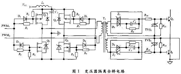 在中頻脈沖滲碳電源中,能快速進(jìn)行過流保護(hù)是至關(guān)重要的,而驅(qū)動(dòng)脈沖無(wú)延遲地傳輸,對(duì)實(shí)時(shí)過流保護(hù)起至關(guān)重要作用;同時(shí)為了減少開關(guān)損耗,還要求很陡的驅(qū)動(dòng)脈沖上升沿和下降沿;一些特殊場(chǎng)合要求緊湊而簡(jiǎn)潔、不附加驅(qū)動(dòng)電源等。綜合考慮以上要求,采用變壓器隔離全橋驅(qū)動(dòng)電路,其電路如圖1所示。