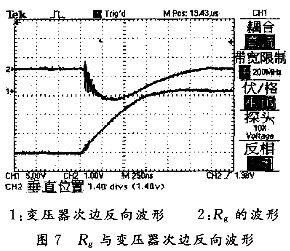 R1實(shí)際值很小,可以忽略。穩(wěn)壓二極管并聯(lián)在D1,C1兩端,它的電壓是D1和C1兩端電壓之和。穩(wěn)壓二極管是隨電流大小自動(dòng)調(diào)整的“可變”電阻。通過改變電阻來(lái)控制上升沿和下降沿的速率,從而達(dá)到控制過沖尖峰的大小。實(shí)測(cè)Rg與驅(qū)動(dòng)變壓器次邊反向波形如圖7所示。Rg上電壓波形即為勵(lì)磁電感上流過的電流波形。正脈沖下降沿的過沖尖峰由勵(lì)磁電感造成的: