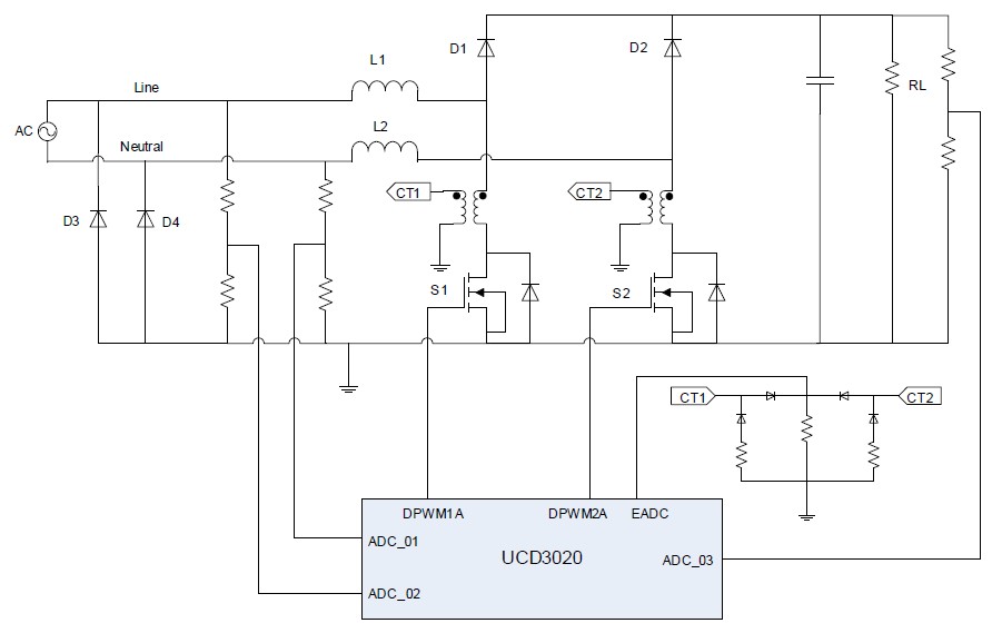 在其他無橋PFC拓撲結(jié)構(gòu)中,圖1是一個已被業(yè)界廣泛采用的無橋PFC實例。它具有兩個DC/DC升壓電路,一個由L1、D1和S1組成,另一個則由L2、D2和S2組成。D3和D4為慢恢復(fù)二極管。通過參考內(nèi)部電源地,分別檢測線路(Line)和中性點(Neutral)電壓,測量得到輸入AC電壓。通過對比檢測到的線路和中性點信號,固件便可知道它是一個正半周,還是一個負半周。在一個正半周內(nèi),第一個DC/DC升壓電路(L1-S1-D1)有效,并且升壓電流通過二極管D4回到AC中性點;在一個負半周內(nèi),第二個DC/DC升壓電路(L2-S2-D2)有效,并且升壓電流二極管通過D3回到AC線。像UCD3020這樣的數(shù)字控制器用于控制這種無橋PFC。