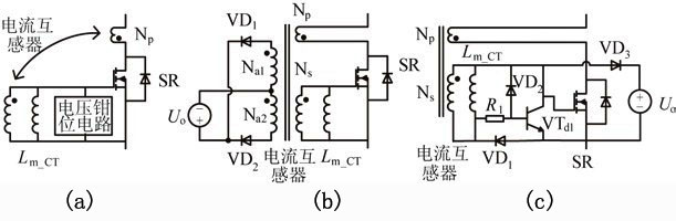 圖7為幾種典型的電流型驅(qū)動方案。傳統(tǒng)的電流型驅(qū)動方案如圖7(a)所示,整個驅(qū)動電路包括一個電流互感器(CT)和一個電壓箝位電路。電路通過電流互感器對電流信號進行采樣,并給同步管提供相應(yīng)的驅(qū)動信號,多余的驅(qū)動能量被箝位電路消耗。該驅(qū)動電路比較簡單,但是有較大的驅(qū)動損耗,限制了變流器效率的提高。因此有文獻提出了具有剩余驅(qū)動能量回饋功能的電流型驅(qū)動方案,如圖7(b)所示。該驅(qū)動電路中多余的驅(qū)動能量能通過輔助繞組回饋到主電路,從而可以較大的減少驅(qū)動電路的損耗,并簡化電流互感器的設(shè)計,但是多繞組的電流互感器大大增加了生產(chǎn)成本。另有文獻提出了一種更為簡單的電流型驅(qū)動方案,如圖7(c)所示。該方案的電流互感器只需一個副邊繞組,同時也具有剩余驅(qū)動能量回饋的功能,更加有利于實際的生產(chǎn)應(yīng)用。通過三極管VTd1,它可以準確地檢測同步整流管應(yīng)該關(guān)斷的時刻,從而保證了同步整流電路的可靠性。