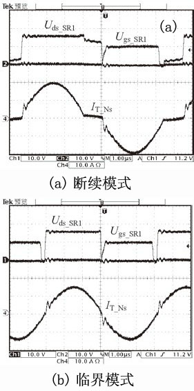 本文針對倍壓整流結(jié)構(gòu)提出的一種新型的電流型同步整流方案,如圖10所示。通過一個雙繞組電流互感器,既解決了二次側(cè)上管驅(qū)動電路采樣的能量回饋問題,又減少了電流互感器的數(shù)量,有利于降低生產(chǎn)成本,提高變換效率及功率密度。圖11為斷續(xù)模式和臨界模式下的主要實驗波形。
