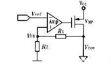間接閉環(huán)控制環(huán)路如圖1所示,該控制環(huán)路包括一個(gè)誤差放大器,反饋環(huán)路和調(diào)整管(VMP管)。工作原理是由誤差放大器將輸出反饋電壓VFB與參考電壓Vref進(jìn)行比較,并放大其差值(Vref-VFB)以此來(lái)控制調(diào)整管(VMP)的導(dǎo)通狀態(tài),實(shí)現(xiàn)負(fù)反饋,從而得到穩(wěn)定的輸出Vcon。電路剛啟動(dòng)時(shí),反饋電壓VFB很低,如果穩(wěn)壓器啟動(dòng)時(shí)產(chǎn)生較大的電容(或者負(fù)載電容很大)或VMP管導(dǎo)通時(shí)有較小的電阻,浪涌電流(即流過(guò)VMP管的瞬間電流)就會(huì)很大,有時(shí)會(huì)接近穩(wěn)壓器的電流限值。因此,必須在誤差放大器中設(shè)計(jì)軟啟動(dòng)電路,以保證整個(gè)電路在上電后進(jìn)入正常的直流偏置狀態(tài),不會(huì)產(chǎn)生浪涌電流。