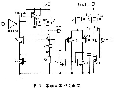 由上面分析可知,由于N2節(jié)點(diǎn)電壓迅速變化,導(dǎo)致大的浪涌電流流過(guò)P功率管(VMP管)。因此只需要控制N2節(jié)點(diǎn)電壓的變化就可以實(shí)現(xiàn)電流的控制,控制該浪涌電流變化無(wú)非就是控制其變化的斜率和峰值。其具體的電路原理圖包括兩個(gè)部分,即浪涌電流的斜率控制部分和峰值控制部分。具體的實(shí)現(xiàn)電路如圖3所示。