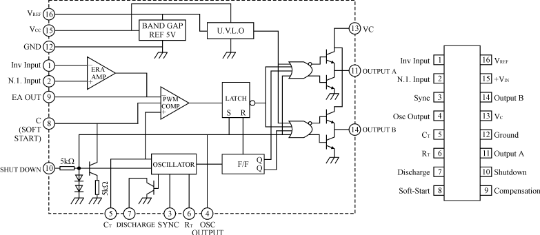 SG3525為16腳芯片,具體的內部結構和封裝如圖3所示。其中,腳16為SG3525的基準電壓源輸出,精度可以達到(5.1±1%)V,采用了溫度補償,而且設有過流保護電路。腳5,腳6,腳7內有一個雙門限比較器,內電容充放電電路,加上外接的電阻電容電路共同構成SG3525的振蕩器。振蕩器還設有外同步輸入端(腳3)。腳1及腳2分別為芯片內誤差放大器的反相輸入端、同相輸入端。該放大器是一個兩級差分放大器,直流開環(huán)增益為70dB左右。根據(jù)系統(tǒng)的動態(tài)、靜態(tài)特性要求,在誤差放大器的輸出腳9和腳1之間一般要添加適當?shù)姆答佈a償網(wǎng)絡。
