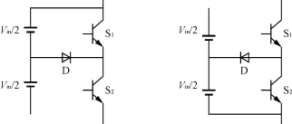 文獻(xiàn)[2]分析了三電平DC/DC變換器的推導(dǎo)過程:用兩只開關(guān)管串聯(lián)代替一只開關(guān)管以降低電壓應(yīng)力,并引入一只箝位二極管和箝位電壓源(它被均分為兩個(gè)相等的電壓源)確保兩只開關(guān)管電壓應(yīng)力均衡。電路中開關(guān)管的位置不同,其箝位電壓源與箝位二極管的接法也不同。文中提取出兩個(gè)三電平開關(guān)單元如下圖1所示。圖1(a)中,箝位二極管的陽極與箝位電壓源的中點(diǎn)相連,稱之為陽極單元;圖1(b)中,箝位二極管的陰極與箝位電壓源的中點(diǎn)相連,稱之為陰極單元。