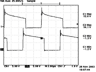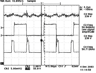 (b)圖中,示意了隔離變壓器副邊輸出的兩路驅(qū)動(dòng)波形,可以直接驅(qū)動(dòng)開關(guān)管。從圖中可以看出驅(qū)動(dòng)波形比較理想:有快速的上升沿,并在一開始有一定的過沖,可以加速開通,減小了開通損耗;同時(shí),有反偏截止電壓,提供了足夠的反相門極驅(qū)動(dòng),減小了下降時(shí)間;很好地驗(yàn)證了驅(qū)動(dòng)電路的設(shè)計(jì)是合理的。