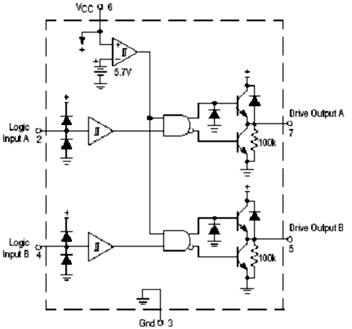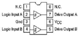 MC34152的外圍電路簡(jiǎn)單,應(yīng)用方便。它是8管腳的同相推挽驅(qū)動(dòng)芯片,具體的內(nèi)部結(jié)構(gòu)和封裝如圖4所示。2,4腳為兩路控制信號(hào)輸入,經(jīng)過芯片內(nèi)部的推挽放大,直接輸出同相的兩路驅(qū)動(dòng)信號(hào)(7,5腳)。為使芯片更加穩(wěn)定地工作,一般在芯片的電源端并聯(lián)一個(gè)濾去高頻干擾的瓷片電容和一個(gè)濾去低頻干擾的電解電容。