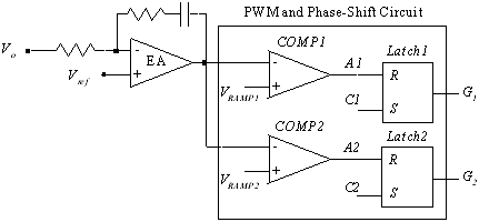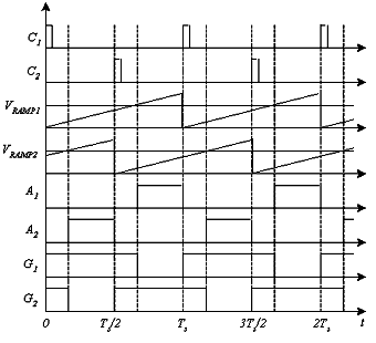 如圖3所示,時(shí)鐘信號(hào)C1和C2相差180度,它們分別對(duì)應(yīng)的鋸 VRAMP1 和 VRAMP2 也相差180度,電壓誤差放大器的輸出信號(hào) VEA、Vo 分別與 VRAMP1 和 VRAMP2 相比較,再通過兩個(gè)RS觸發(fā)器得到相差180度的驅(qū)動(dòng)信號(hào) G1 和 G2 。