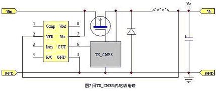 圖7示出的是采用TX_CMB3型驅(qū)動(dòng)模塊的斬波電路,該驅(qū)動(dòng)組件是北京落木源公司(www.pwrdriver.com)新開發(fā)出的單管隔離驅(qū)動(dòng)器。該款驅(qū)動(dòng)器使用變壓器隔離,采用分時(shí)技術(shù),在輸入信號(hào)的上升和下降沿傳遞PWM的信號(hào),在平頂階段傳遞能量,因而能夠輸出陡峭的驅(qū)動(dòng)脈沖。這種驅(qū)動(dòng)方法的優(yōu)點(diǎn)是使用方便(在MOSFET功率不大時(shí),只要如圖7連接就可以了),驅(qū)動(dòng)脈沖質(zhì)量好,工作頻率高,體積較小,輸入電壓最高可達(dá)1000V,價(jià)格也比較便宜。缺點(diǎn)是工作頻率低時(shí)要求的變壓器體積比較大,同時(shí)成本稍高些,但考慮到簡化了設(shè)計(jì)、并降低了裝配成本,總成本可能還要低些。