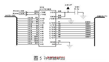 通過軟件參與設(shè)置,很容易得到全頻段內(nèi)的預置誤差數(shù)據(jù)。對于2-20GHz的微波振蕩器,如果每隔5MHz設(shè)置補償一個點,那么存儲器至少需要3600個地址空間,在此選擇8k×8靜態(tài)存儲器芯片,存儲空間滿足要求。在時鐘的同步控制下,地址生成器產(chǎn)生對應地址,該系列數(shù)據(jù)被存入RAM中,電路如圖5所示。
