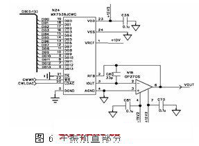 在主振預置電路D/A部分,為了照顧2-20GHz全頻段能有較為精細的預置分辨率,并且滿足△Data插值需要,在此選擇了14位D/A轉(zhuǎn)換器,使用時在數(shù)據(jù)范圍0~16383兩端預留一定的插值空間,電路如圖6所示。