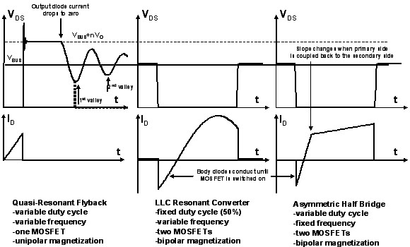 圖1所示為采用三種不同拓撲 (準諧振反激式拓撲、LLC諧振拓撲和使用軟開關(guān)技術(shù)的非對稱半橋拓撲) 的開關(guān)的電壓和電流波形。