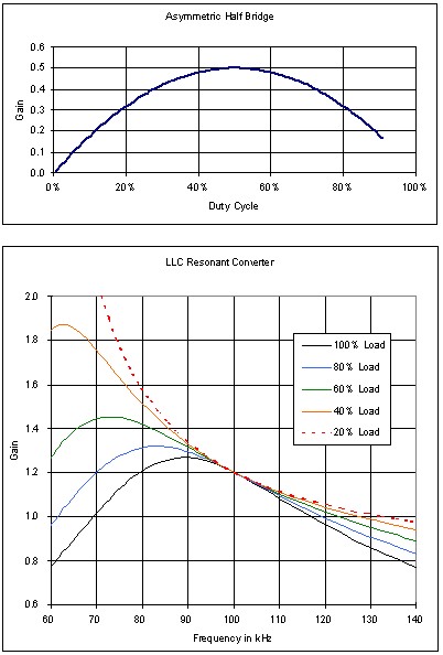 圖2:非對稱半橋和LLC轉(zhuǎn)換器的增益曲線