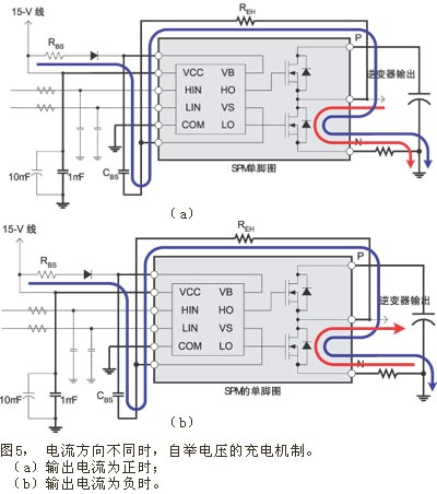 MOSFET逆變器的另一個優(yōu)點是圖4(e)所示的自舉電壓(陰極輸出電壓)。從圖4(e)可以看出,電機(jī)的工作頻率為10Hz。圖中畫出了自舉電壓和逆變器輸出電流。當(dāng)電流為正時,自舉電壓VBS維持在VCC=15V附近,但當(dāng)電流為負(fù)時,VBS就下降到接近10V。這是由于不同電流方向采用不同的充電機(jī)制所造成 (參見圖5)。當(dāng)輸出電流為正時,電流要么流經(jīng)高壓側(cè)MOSFET,要么流經(jīng)低壓側(cè)體二極管。在這種情況下,當(dāng)?shù)蛪簜?cè)體二極管導(dǎo)通時,將對自舉電容CBS充電 (參見圖5(a))。此時,對CBS的充電電壓可由公式(2)表示。
