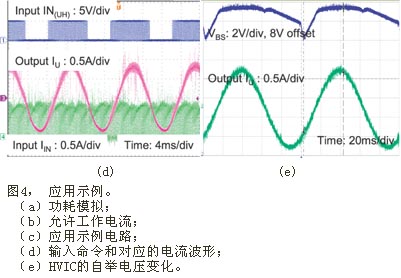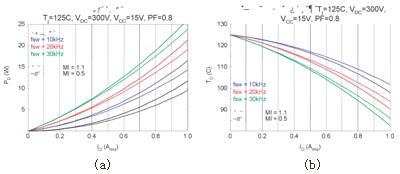 圖4給出了本模塊的一個應(yīng)用示例。在圖4(a)和(b) 的模擬中,假設(shè)結(jié)區(qū)溫度Tj保持為125℃;該溫度為本模塊的最大工作結(jié)區(qū)溫度。通過這項模擬,肯定當(dāng)模塊外殼溫度控制在100℃并采用空間向量調(diào)制 (SVPWM) 時,輸出功率可大于Pout=100W,并允許Pd=16W的功率損耗。根據(jù)這些信息,我們利用一臺130W BLDC電機(jī)(正弦反電動勢) 和圖4(c)所示的電路,對模塊的額定功率進(jìn)行驗證實驗。實驗中采用的散熱片有效表面積約為100cm2。采用該散熱片后,模塊在20kHz SVPWM下可向電機(jī)輸出150W的功率;熱功耗為12W。而此時模塊的外殼溫度為86℃,MOSFET結(jié)區(qū)溫度為104℃,環(huán)境溫度27℃。在同樣條件下采用圖4(d)所示的非連續(xù)PWM時,由于有效開關(guān)頻率降低,模塊的功耗可達(dá)到8W,而逆變器效率可達(dá)到95%。此時,模塊的外殼溫度為62℃,結(jié)區(qū)溫度為82℃(已考慮電機(jī)鐵芯的損耗),逆變器的損耗為整個系統(tǒng)功耗的27%