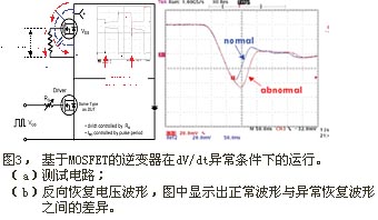 通常,增加?xùn)艠O阻抗會降低MOSFET的開關(guān)速度。在如圖3(a)所示的半橋電路中,如果高壓側(cè)MOSFET的柵極阻抗 (在HVIC中實現(xiàn)) 大,將會存在一定的短路電流;這個電流是上面那個MOSFET導(dǎo)通時的密勒電容Cgd感應(yīng)產(chǎn)生的,不嚴(yán)重時一般不會察覺。但是,正如圖3(b)所示,這種異常行為會增加逆變開關(guān)的損耗 (導(dǎo)通損耗),并最終減弱系統(tǒng)的額定功率和穩(wěn)定性。在這樣的瞬態(tài)過程中,要降低開關(guān)速度,同時又不失穩(wěn)定性,上方那個MOSFET的Vgs應(yīng)小于閾值電壓Vth。換句話說,最好通過調(diào)節(jié)HVIC的關(guān)斷阻抗來保證系統(tǒng)的穩(wěn)定性,防止因電壓變化而感應(yīng)短路電流。但這會增加MOSFET的關(guān)斷dV/dt值。