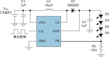 圖1:Step-UP DC/DC 開(kāi)關(guān)電源實(shí)現(xiàn)LED驅(qū)動(dòng)的典型應(yīng)用線路。