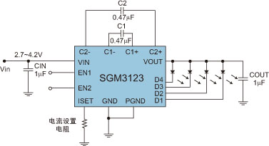 圖2:恒流模式電荷泵SGM3123的典型應(yīng)用線路。